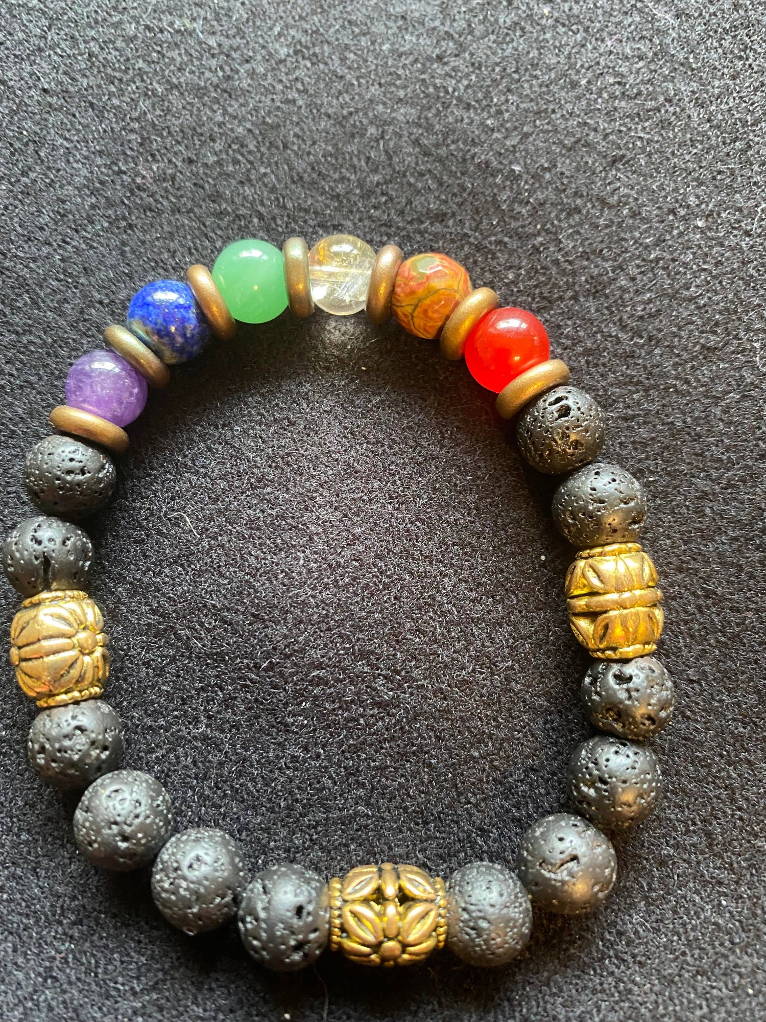Gemstones: Lava, Carnelian, Red Jasper, Quartz, Green Jasper, Lapis, Amethyst, Metal Spacers