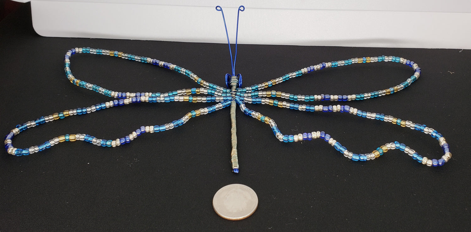 This lovely dragonfly features iridescent beaded wings, and had legs to help it stand on a flat surface. It can also be displayed suspended with wire or string. Look no further for a wonderfully unique gift for that special someone!