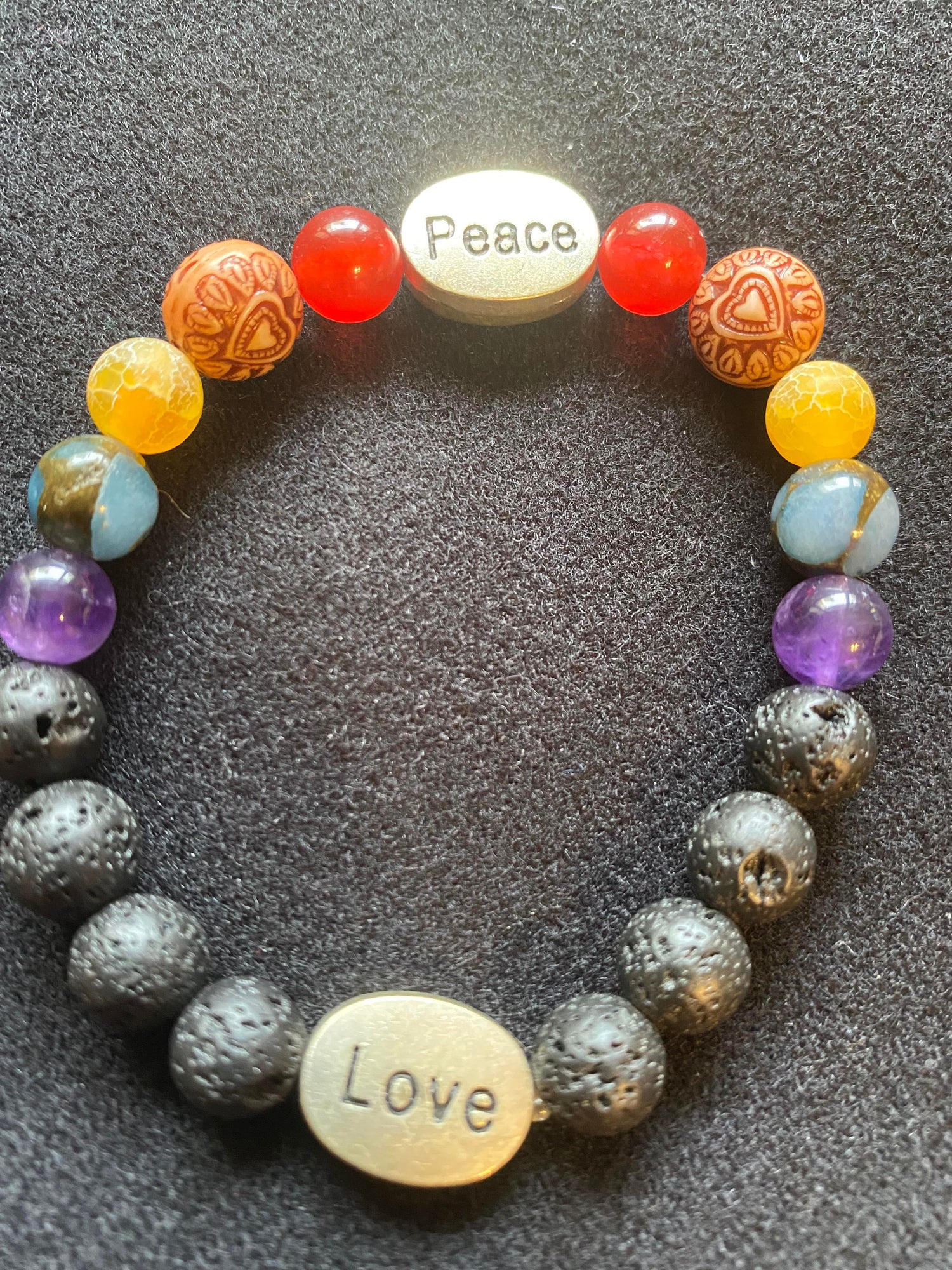 Gemstones: Lava, Amethyst, Impression Jasper, Yellow Crackle Agate, Carnelian and Wood Heart Beads
