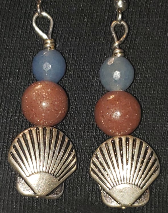 2" dangle earrings featuring a metal seashell with Blue Agate and Picture Jasper beads above and below