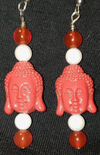 2.5" inch dangle earrings featuring a red resin Buddha head with Carnelian and Howlite beads above and below.