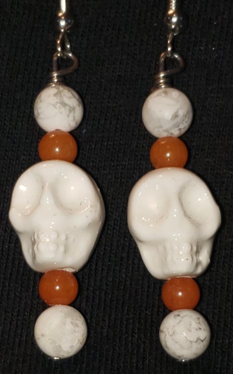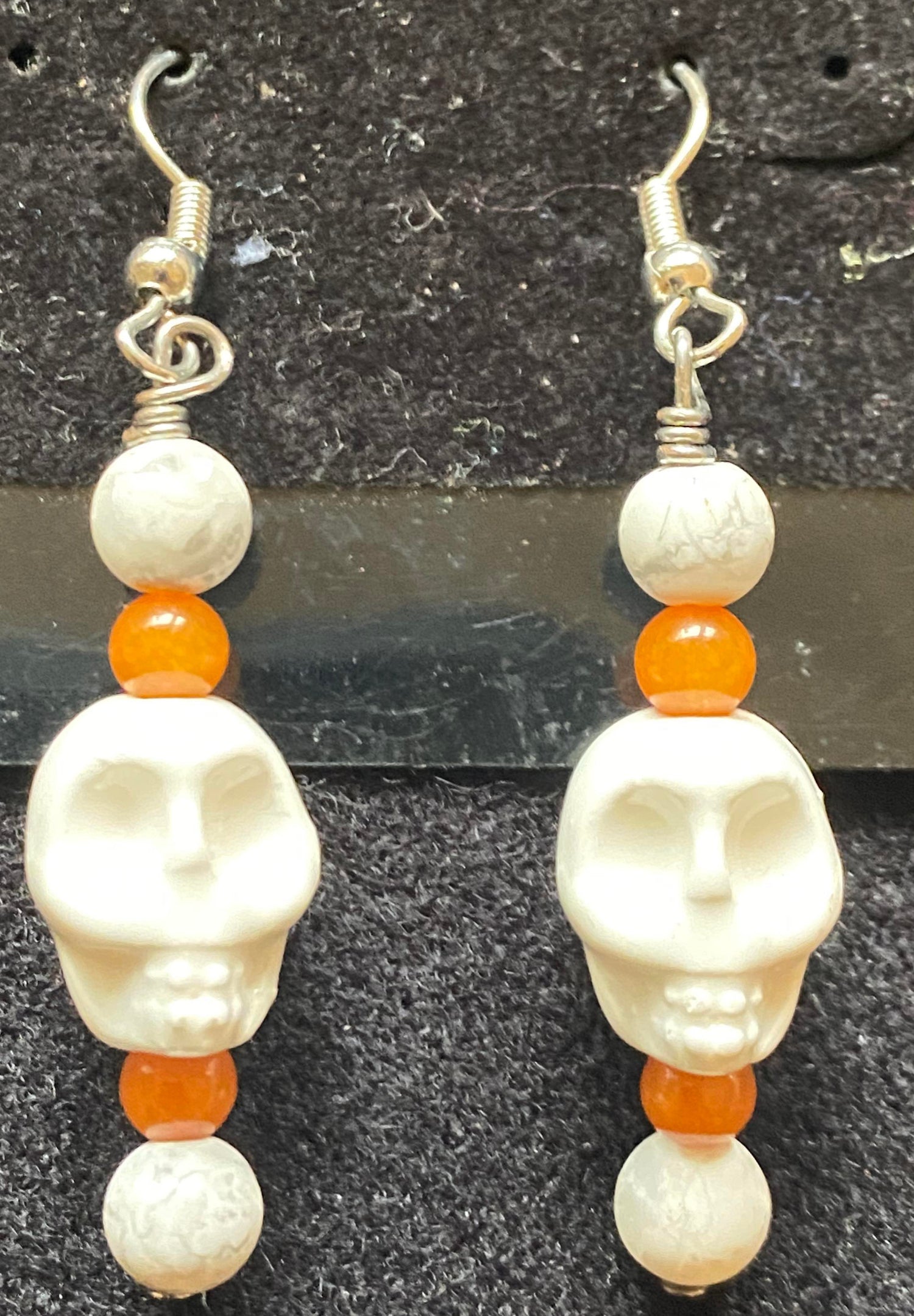 2" dangle earrings featuring a white resin skull with Howlite and Fire Agate beads above and below