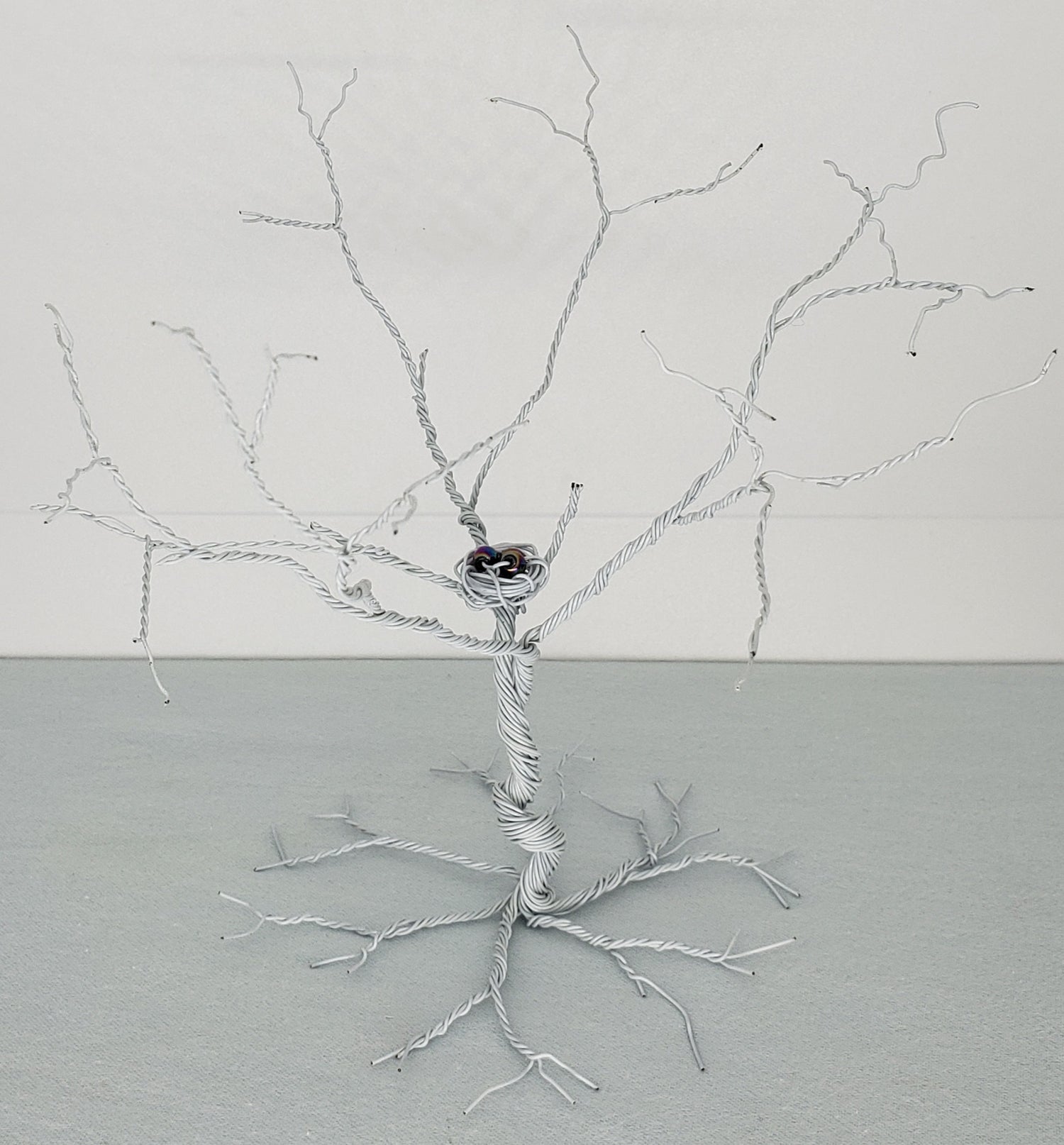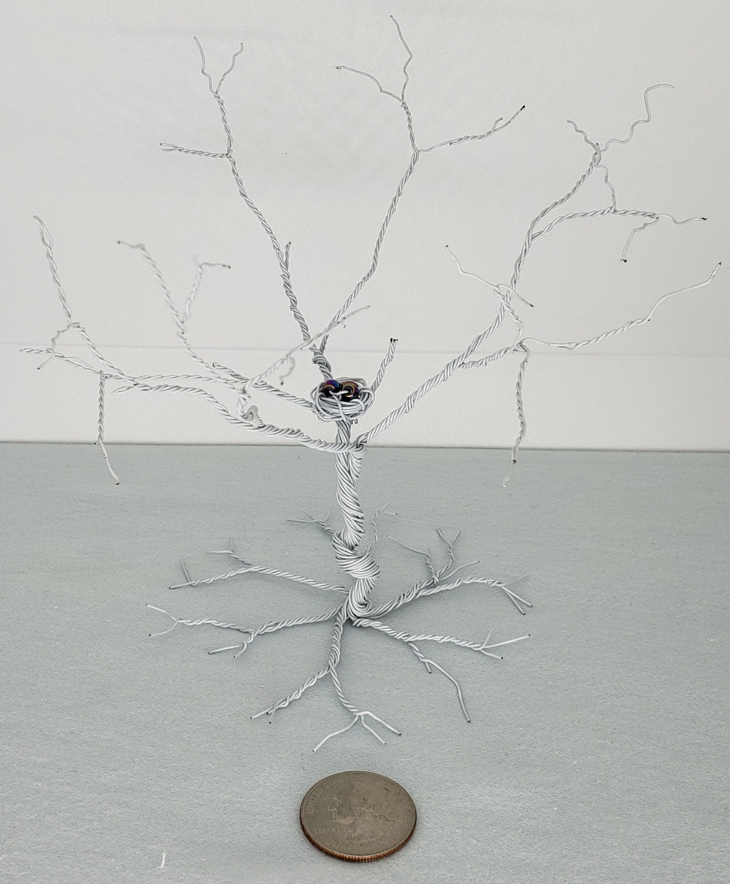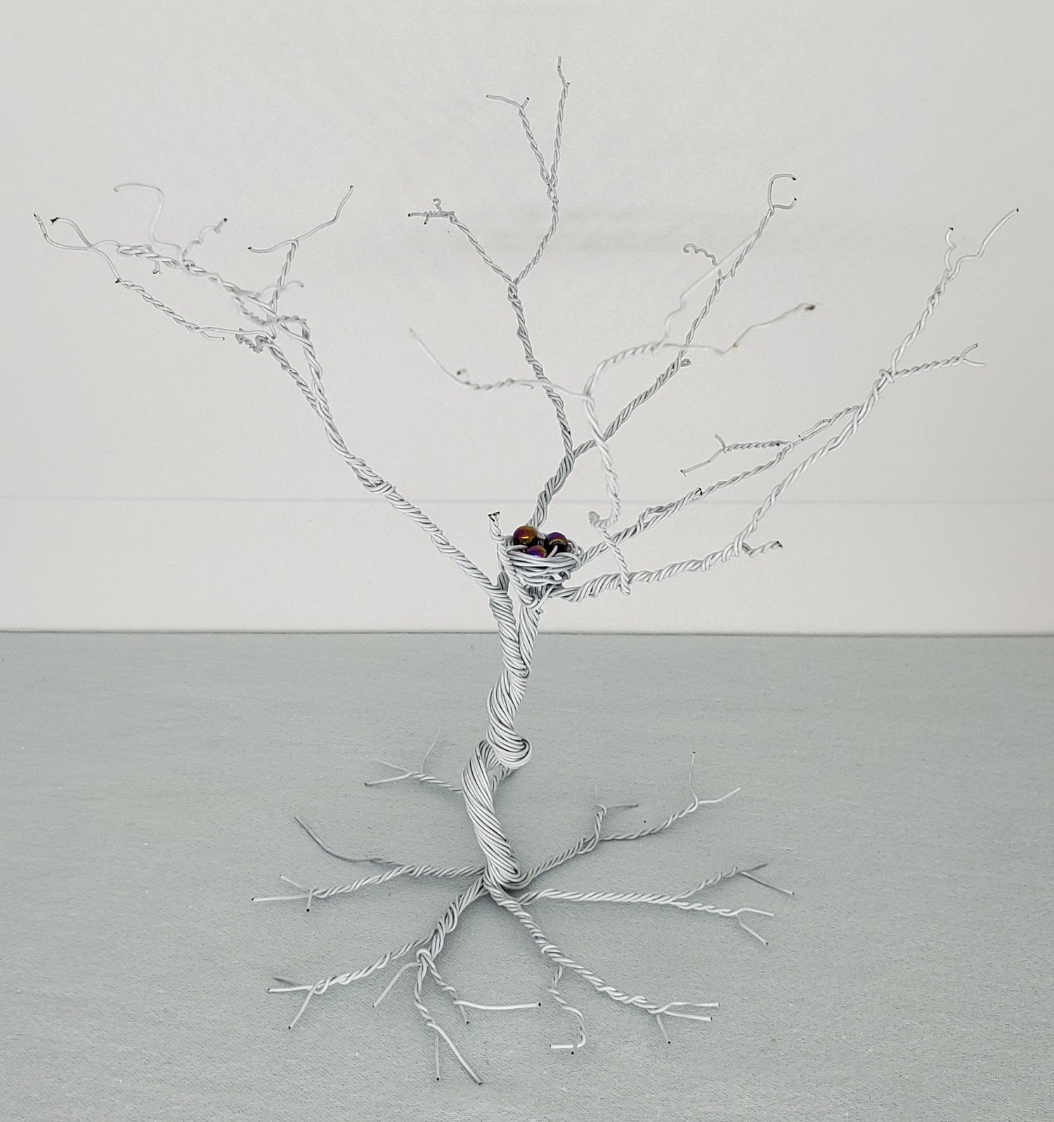 This wonderful little sculpture features white wire, and captures the beauty of nature in winter, when the trees have shed their leaves. Nestled in the center of the tree is a bird's nest containing three "eggs" made from Aurora Borealis Hematite. For only $20 you or someone you love can own this one-of-a-kind work of art! Claim it today!